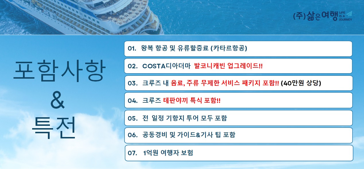 | 🚤 ÀÌÅ»¸®¾Æ NO. 1 ¼±»ç ÄÚ½ºÅ¸ Å©·çÁî(Costa Cruise) ¿Í (ÁÖ) »îÀº¿©ÇàÀÌ ÇÔ²² ÇÏ´Â ·°¼Å¸® ¿©Çà 💕 |